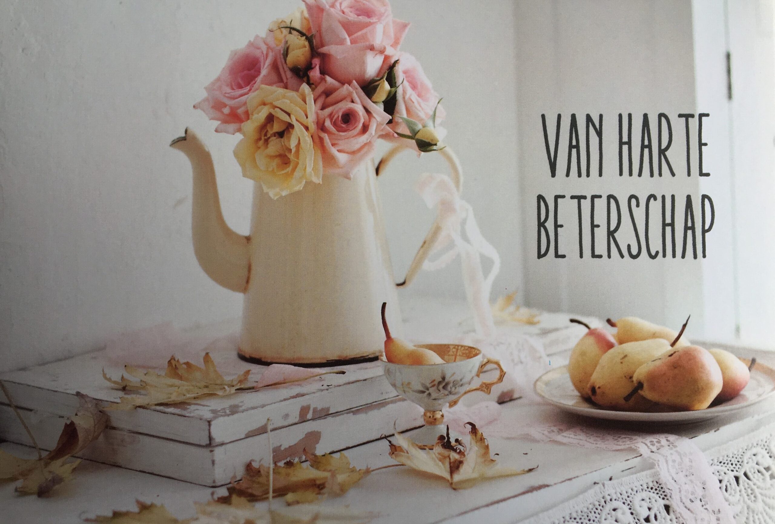 Een witte houten tafel is afgebeeld, afgezet met kant. Op de tafel staan/liggen: een dienblad met een ouderwetse witte kan met daarin witte en roze rozen, een bekertje, een schaal met peren en wat bladeren. Erbij staat “Van harte beterschap”.