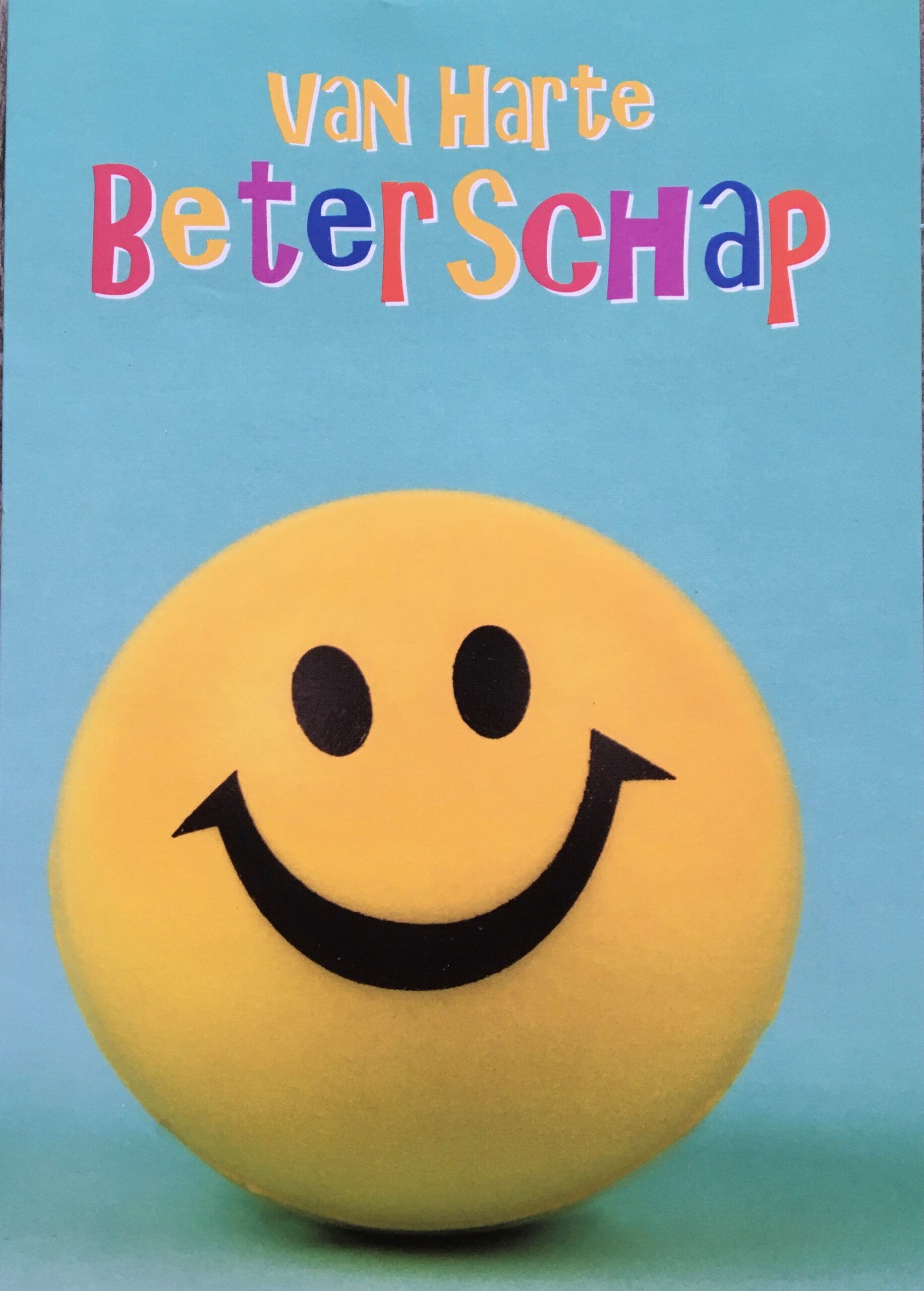 Op een groene kaart staat een smiley afgebeeld (gele bal met lachend gezichtje) met de vrolijk gekleurde tekst “Van harte beterschap”.
