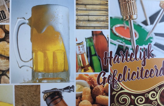 Een stoere cadeau enveloppe met de tekst “Hartelijk gefeliciteerd”. Verder staan er diverse foto’s op: een groot glas bier, bierflesjes, dartbord met pijltjes, borrelhapjes en boomstronken.