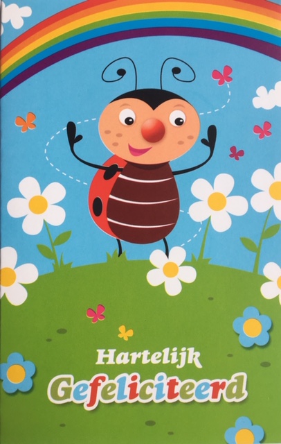 Op de kaart staat “Hartelijk gefeliciteerd”. Daarbij is een vrolijk lieveheersbeestje in het gras met bloemetjes en vlindertjes eromheen te zien. In de lucht zijn wolkjes en een regenboog.