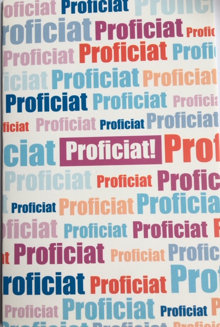 Op de kaart staat veelvuldig het woord “proficiat”. Het staat er in diverse kleuren (blauw, rood, paars, oranje) en grootte.