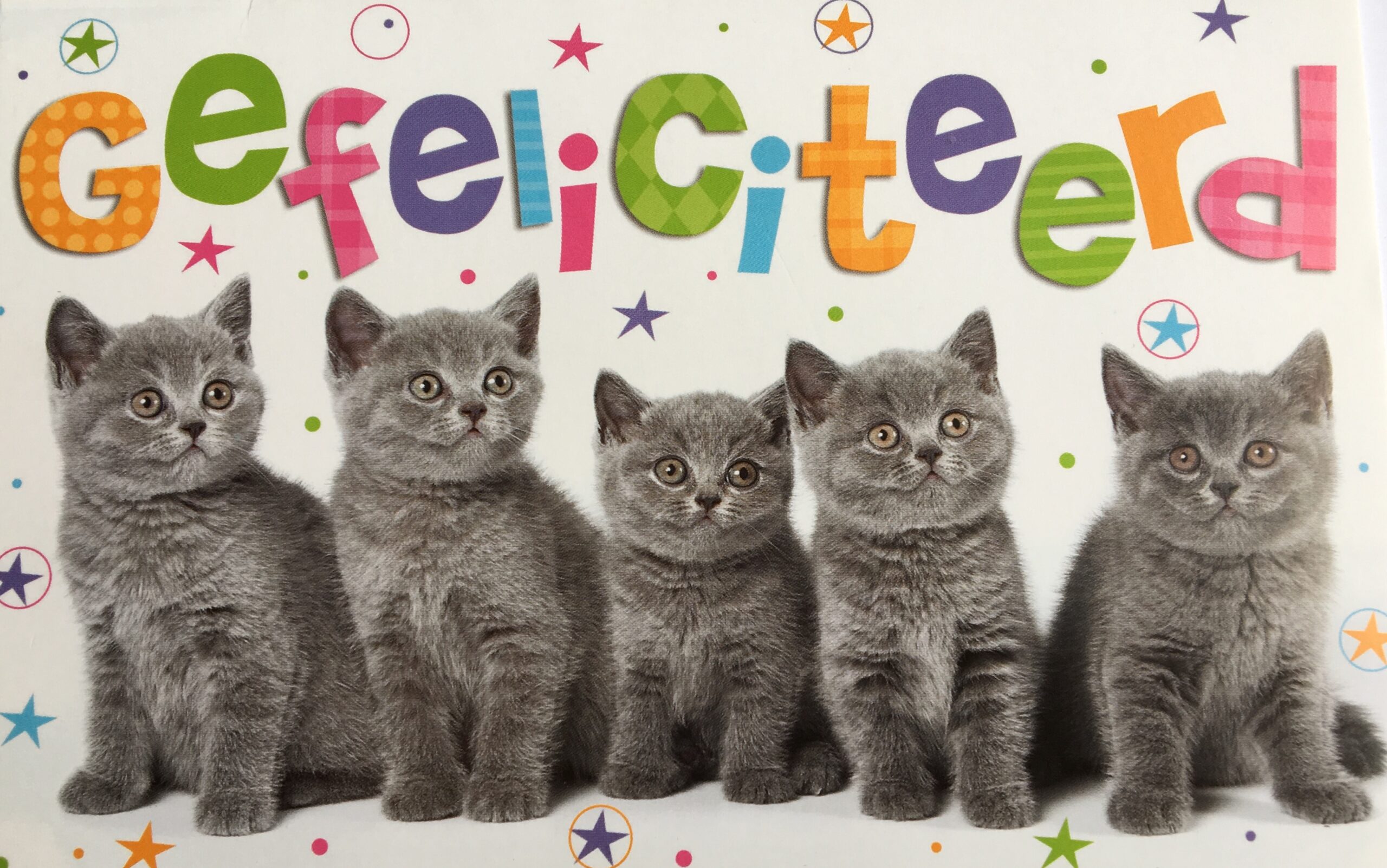 In vrolijke, geleurde letters staat er “Gefeliciteerd”. Daarbij zijn 5 grijze kittens te zien. Ook is de kaart versierd met gekleurde sterretjes en stipjes.