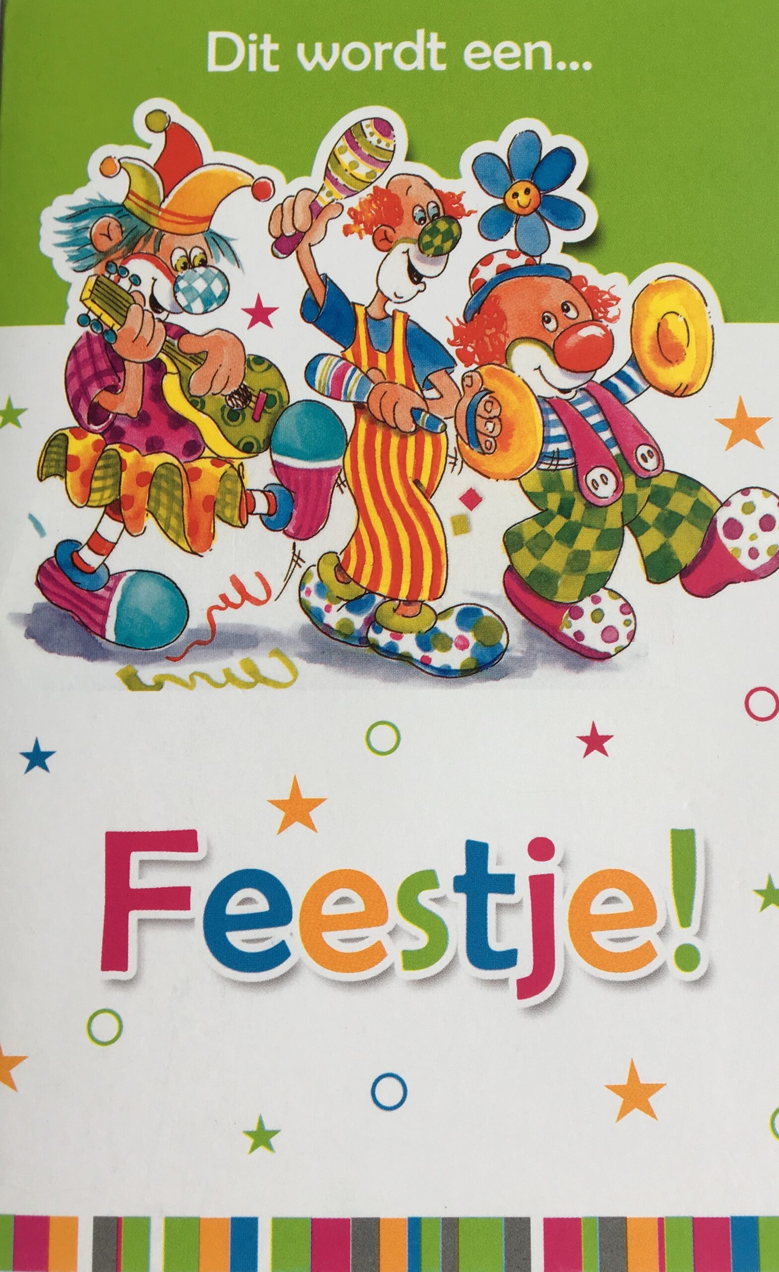 Op de kaart staat “Dit wordt een… feestje!”. Daarbij zijn 3 blije, dansende clowns afgebeeld. Ze bespelen alledrie een instrument (gitaar, sambaballen en bekkens). Bovenaan de kaart is een groen gekleurd vlak, onderaan een vlak met allerlei kleurtjes. Verder is de kaart versierd met gekleurde sterretjes en stippen.
