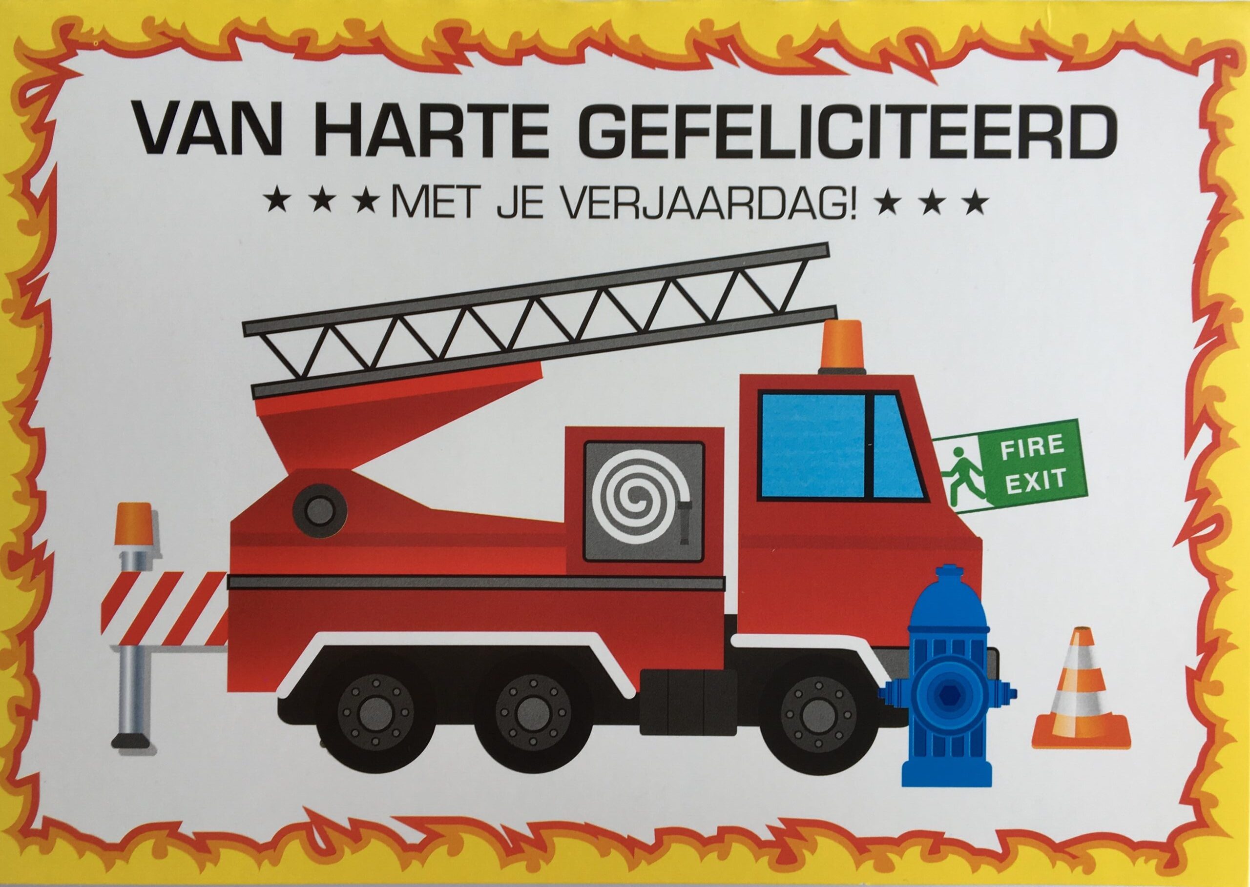 Op de kaart staat “Van harte gefeliciteerd met je verjaardag”. Erbij staat een animatie van een rode brandweerwagen met zwaailicht en ladder op het dak. Daarnaast nog een afbeelding van een pion en een brandkraan. Langs de rand van de kaart zijn vlammen te zien.